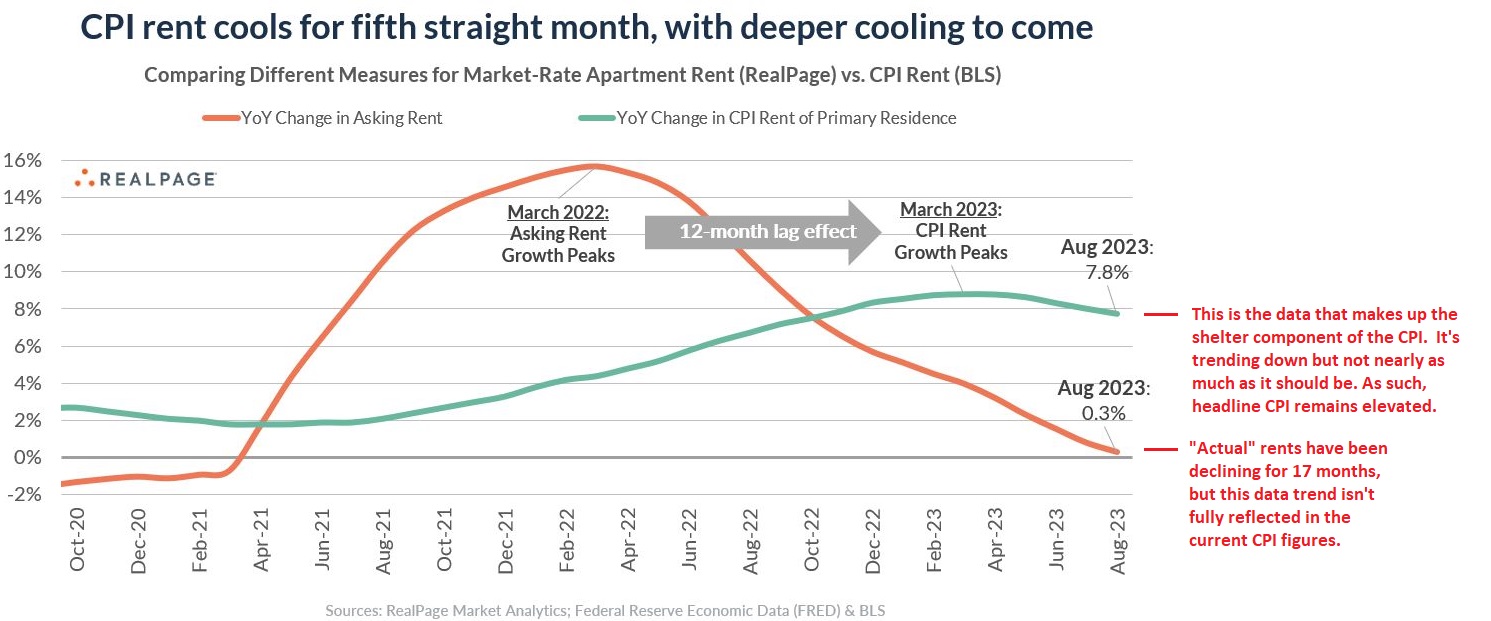OK…now let’s look at the below chart which plots the shelter component (CPI Rent) against actual Asking Rents. Notice how there is a 12-month lag between the two datasets. Actual rents (in orange) shave been falling since 3/2022, but the CPI rent component (in green) was still rising and didn’t peak until 3/2023 – 12 months later! Keep in mind, this is what the Fed watches – a 12-month lagging indicator that makes up almost 33% of the CPI. UGH!! So what’s the bottom line here?